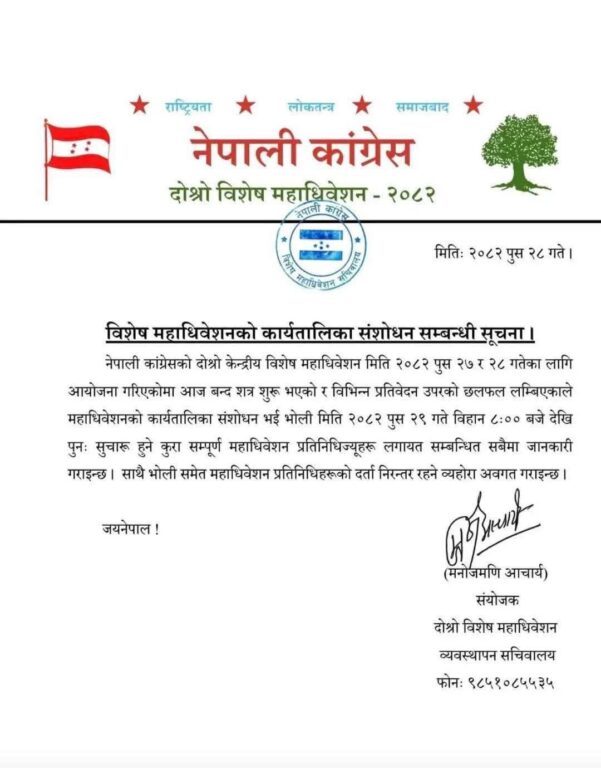 विशेष महाधिवेशन व्यवस्थापन सचिवालयका संयोजक मनोजमणि आचार्यद्वारा जारी सूचनामा सबै महाधिवेशन प्रतिनिधि तथा सम्बन्धित पक्षलाई संशोधित कार्यतालिकाबारे जानकारी गराइएको छ।