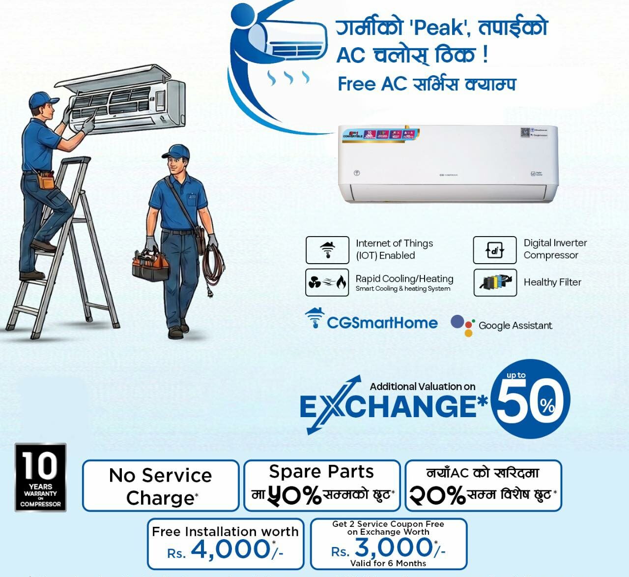 · नयाँ खरिदमा २० प्रतिशतसम्म छुट : नयाँ सीजी एसीको खरिदमा ग्राहकले सिधै २०% सम्मको विशेष नगद छुट पाउनेछन् ।