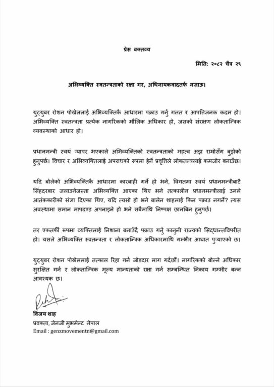 जेन-जी मुभमेन्ट नेपालले पोख्रेललाई तत्काल रिहा गर्न माग गर्दै नागरिकको बोल्ने अधिकारको संरक्षण गर्न सम्बन्धित निकाय गम्भीर बन्नुपर्नेमा जोड दिएको छ ।