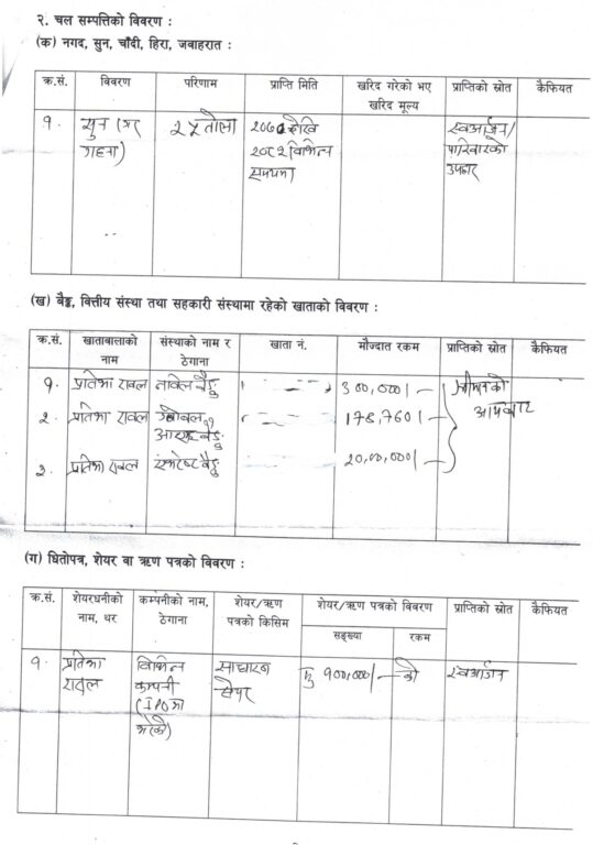 चल सम्पत्तितर्फ २५ तोला सुन रहेको विवरणमा उल्लेख छ। सो सुन स्वआर्जन र परिवारबाट प्राप्त उपहारका रूपमा रहेको जनाइएको छ। बैंक मौज्दाततर्फ विभिन्न बैंकमा गरी २४ लाख रुपैयाँभन्दा बढी रकम बचत रहेको छ। उक्त बचत पनि श्रीमानको आयबाट संकलित भएको विवरणमा उल्लेख गरिएको छ।