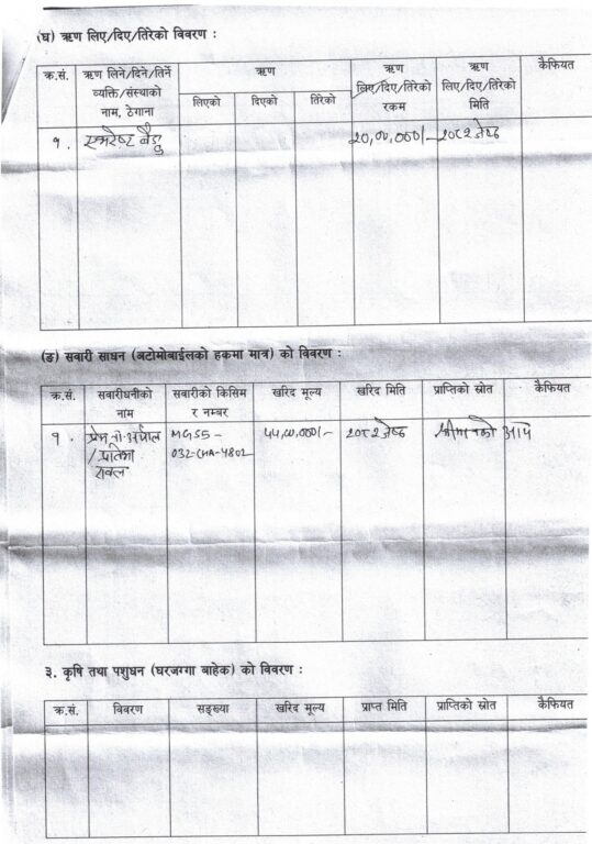 साथै, एभरेष्ट बैंकबाट २०८२ साल जेठमा २० लाख रुपैयाँ ऋण लिएको विवरणमा देखिन्छ। सवारी साधनतर्फ मन्त्रीसँग ४४ लाख रुपैयाँ मूल्यको गाडी रहेको उल्लेख गरिएको छ।