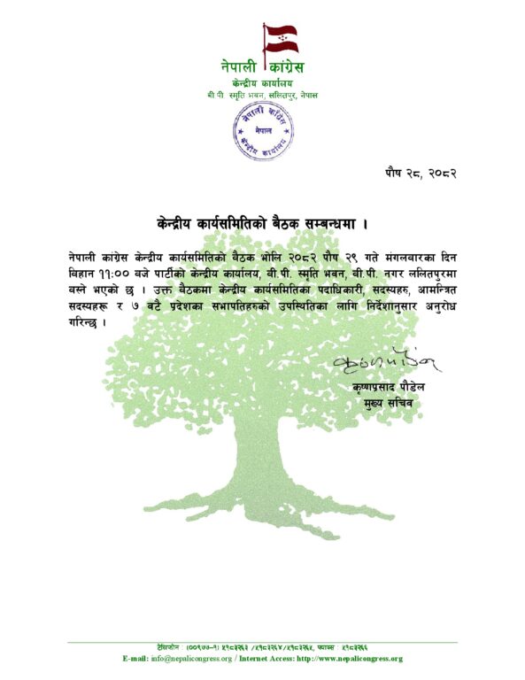 बैठकमा केन्द्रीय कार्यसमितिका पदाधिकारी, सदस्यहरु र सात वटै प्रदेशका सभापतिहरूलाई उपस्थितिका लागि अनुरोध गरिएको छ ।
