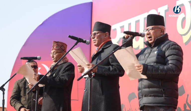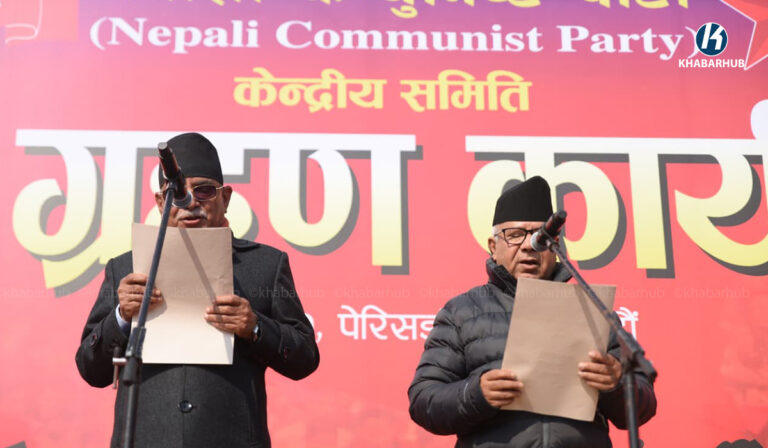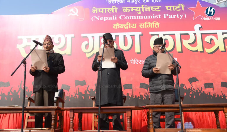 काठमाडौं– नेपाली कम्युनिष्ट पार्टीका संयोजक प्रचण्ड, सहसंयोजक माधव नेपाल तथा केन्द्रीय सदस्यहरूले शपथ ग्रहण गरेका छन् ।
