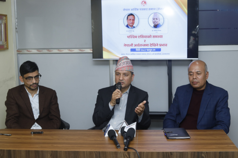 नेपाल आर्थिक पत्रकार समाज (सेजन)ले आयोजना गरेको ‘पश्चिम एसियाको समस्या र नेपाली अर्थतन्त्रमा देखिने प्रभाव’ विषयक अन्तरक्रियामा अर्थ–आप्रावसन क्षेत्रका जानकारहरुले उक्त सङ्कटबाट जोगिन जतिसक्दो चाँडो पूर्वतयारीका काम अघि बढाउन सरकारको ध्यानाकर्षण गराए ।