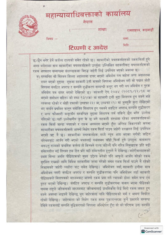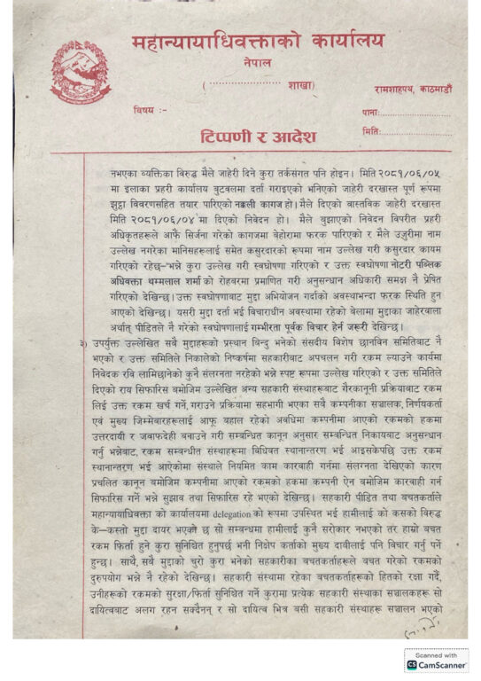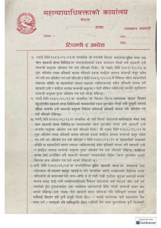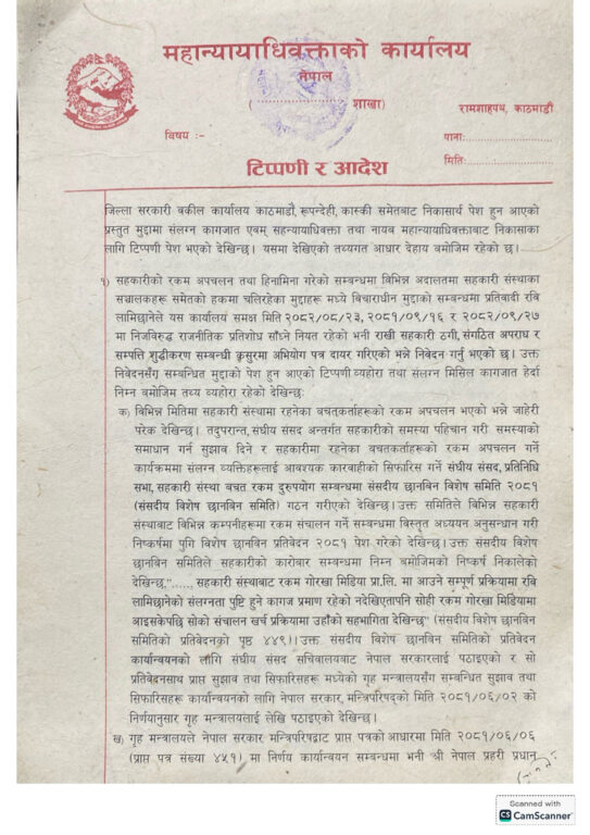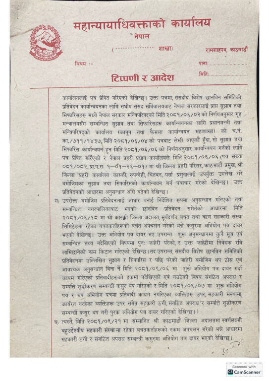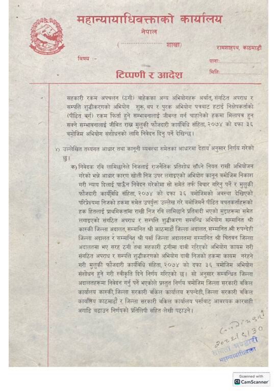 उनी नेतृत्वको महान्यायाधिवक्ताको कार्यालयले लामिछानेविरुद्ध विभिन्न अदालतमा विचाराधीन संगठित अपराध र सम्पत्ति शुद्धीकरणको मुद्दा फिर्ता लिन सम्बन्धित सरकारी वकिलको कार्यालयलाई स्वीकृति दिएको हो ।