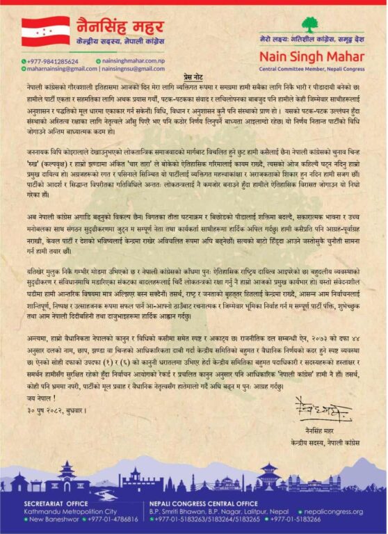 काठमाडौं- नेपाली कांग्रेसका केन्द्रीय सदस्य नैनसिंह महरले पार्टी विधान, लोकतान्त्रिक अभ्यास र संस्थागत प्रक्रियाको सम्मान गर्नुपर्नेमा जोड दिएका छन् । उनले पार्टीभित्र पछिल्लो समय देखिएका गतिविधिहरूलाई विधानसम्मत र लोकतान्त्रिक ढंगले समाधान गर्नुपर्ने उल्लेख गरेका छन् ।