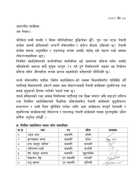 संवेदनशील समयमा ‘विशेष महाधिवेशन’ को नाममा विधानविपरीत गतिविधि गर्दै पार्टीलाई विभाजनतर्फ धकेल्ने प्रयास आम लोकतन्त्रवादी, नेपाली कांग्रेसका शुभचिन्तक तथा समग्र देशको हितविपरीत रहेको उनीहरूको ठहर छ।