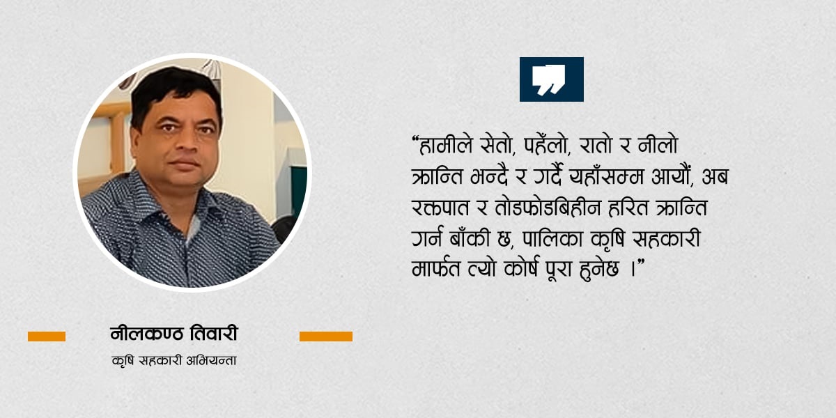 यसबाहेक उनी थप्छन्, ‘हामीले सेतो, पहेँलो, रातो र नीलो क्रान्ति भन्दै र गर्दै यहाँसम्म आयौं, अब रक्तपात र तोडफोडबिहीन हरित क्रान्ति गर्न बाँकी छ, पालिका कृषि सहकारी मार्फत त्यो कोर्ष पूरा हुनेछ ।’