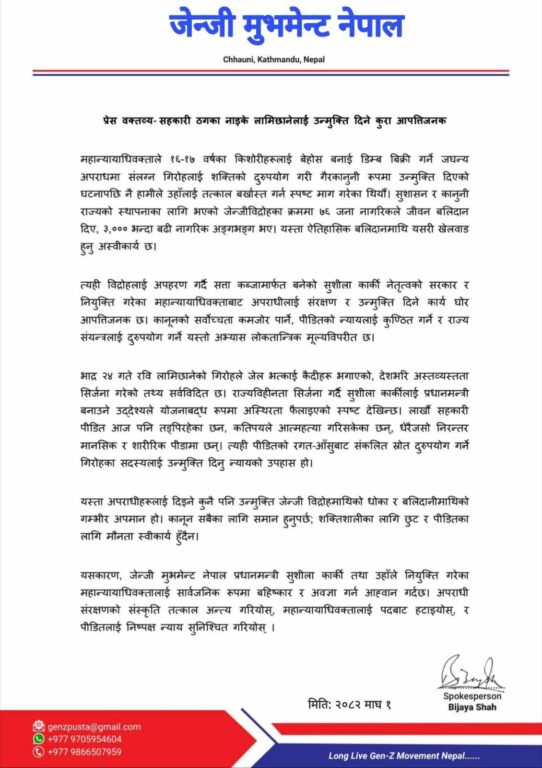सङ्गठित अपराधमा लामिछानेलाई उन्मुक्ति दिनखोज्नु आपत्तिजनक : जेनजी मुभमेन्ट