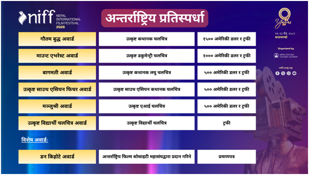 निफको शीर्ष अवार्ड सर्वोत्कृष्ट अन्तर्राष्ट्रिय फिचर चलचित्रका विजेता ‘गौतम बुद्ध अवार्ड’बाट एक हजार पाँच सय (१,५००) अमेरिकी डलर नगद र ट्रफीले पुरस्कृत हुनेछन् ।