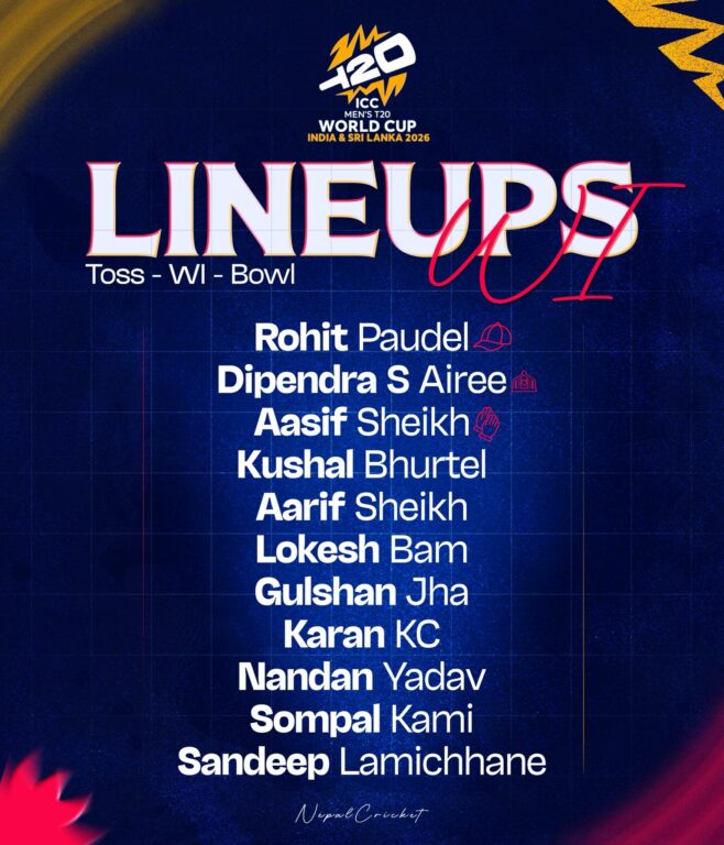 काठमाडौं – आईसीसी टी–२० विश्वकपमा नेपालले वेस्ट इन्डिजविरुद्ध सुरुमा ब्याटिङ गर्ने भएको छ । भारतको मुम्मबईस्थित वनखेडे मैदानमा टस जितेर वेस्ट इन्डिजले पहिला फिल्डिङ गर्ने निर्णय गरेपछि नेपालले ब्याटिङ गर्ने भएको हो ।