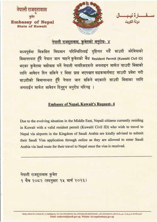 काठमाडौं- कुवेतस्थित नेपाली दूतावासले नेपाल फर्किन चाहने कुवेतमा रहेका नेपालीलाई साउदी अरब हुँदै फर्किन अनुरोध गरेको छ ।