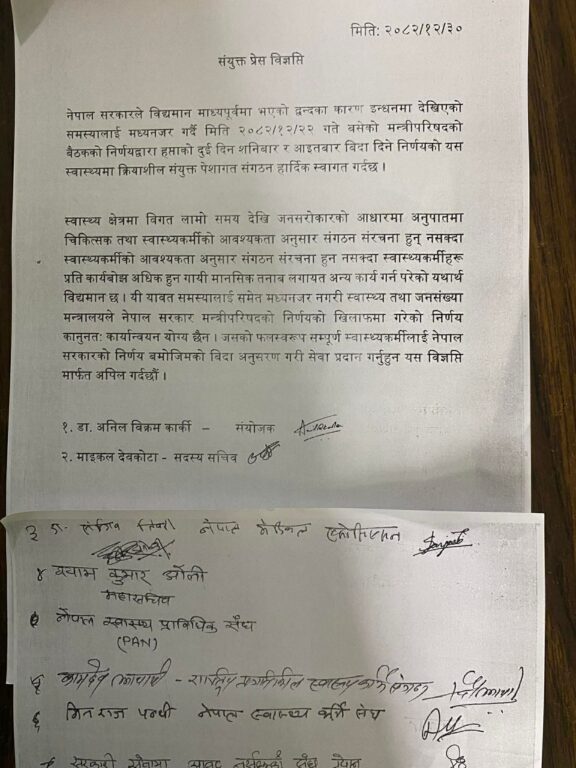 लामो समयदेखि जनशक्तिको अभावका कारण स्वास्थ्य संस्थाहरूमा चिकित्सक तथा स्वास्थ्यकर्मीको आवश्यकता अनुसार संगठन संरचना विकास हुन नसकेको विज्ञप्तिमा उल्लेख गरिएको छ ।