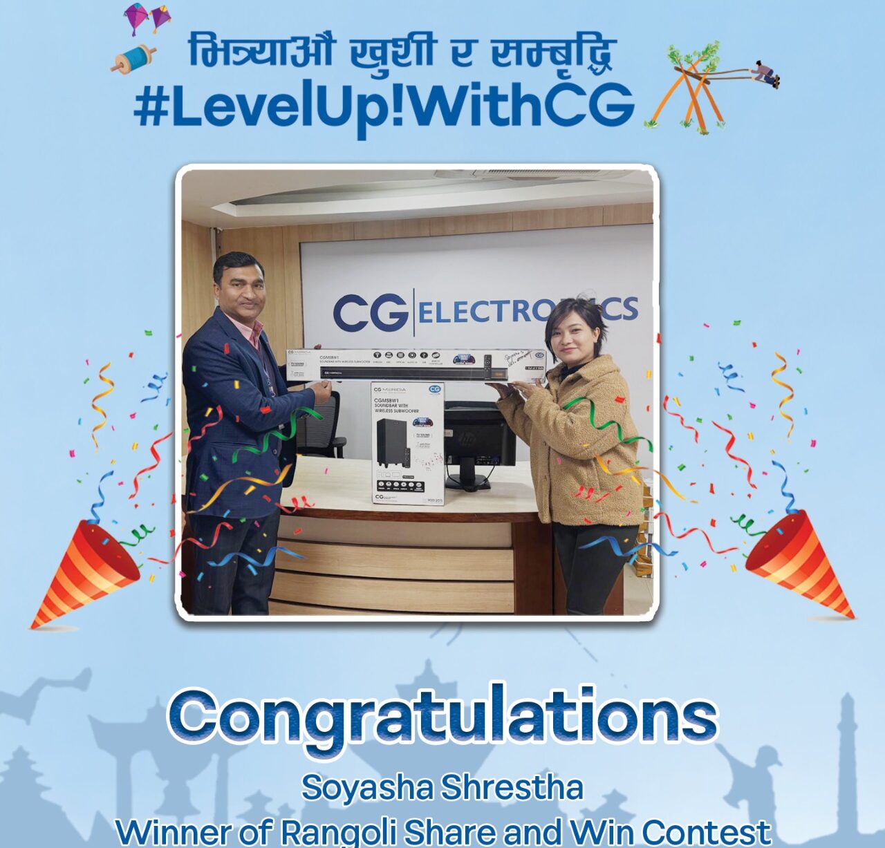 काठमाडौं– सिजी ब्रान्डले तिहारमा आयोजना गरेको ‘तिहार रंगोली फोटो सेयर तथा जित’ प्रतियोगिताका विजेता स्वयम्भू निवासी सोयशा श्रेष्ठलाई सिजी मेरिडिया साउण्ड बार प्रदान गरिएको छ । यो साउन्ड बारले उच्च गुणस्तरीय ध्वनि र उत्कृष्ट सांगीतिक अनुभव प्रदान गर्दछ ।