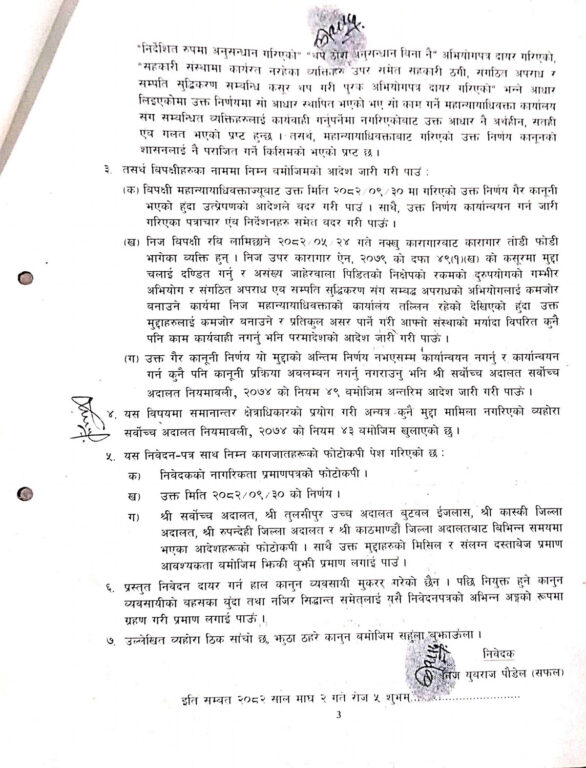 निवेदक पौडेलले आफू कानूनको शासनप्रति प्रतिबद्ध नागरिक भएको र गम्भीर सार्वजनिक सरोकारका विषयमा सर्वोच्च अदालतको शरण लिनु आफ्नो कर्तव्य भएको बताएका छन्।