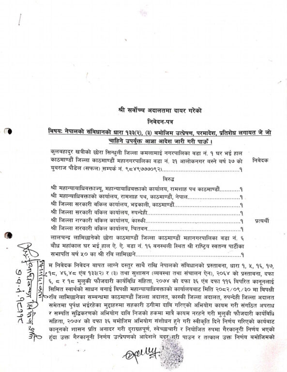 उता अर्को रिट युवराज पौडेल ‘सफल’ ले पनि दायर गरेका छन्। रिटमा महान्यायाधिवक्ताको कार्यालयले पुस ३० गते रवि लामिछानेसम्बन्धी मुद्दामा संगठित अपराध र सम्पत्ति शुद्धीकरणको अभियोग कायम नरहने गरी अभियोग संशोधन गर्न स्वीकृति दिएको निर्णय गैरकानूनी भएको दाबी गरिएको छ।