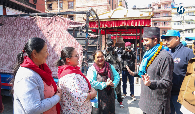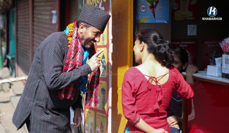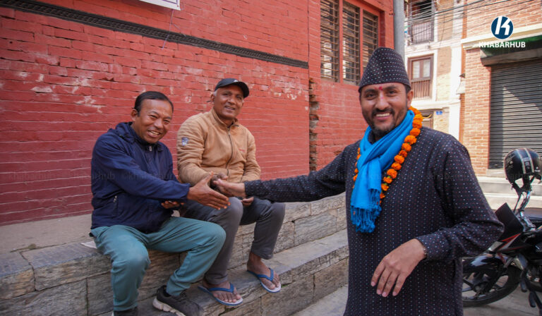 घरदैलो कार्यक्रम ललितपुरको पाटन ढोकामा मतदातालाई भेट्दै खरेलले आफूलाई मत दिन अनुरोध गरेका छन् ।