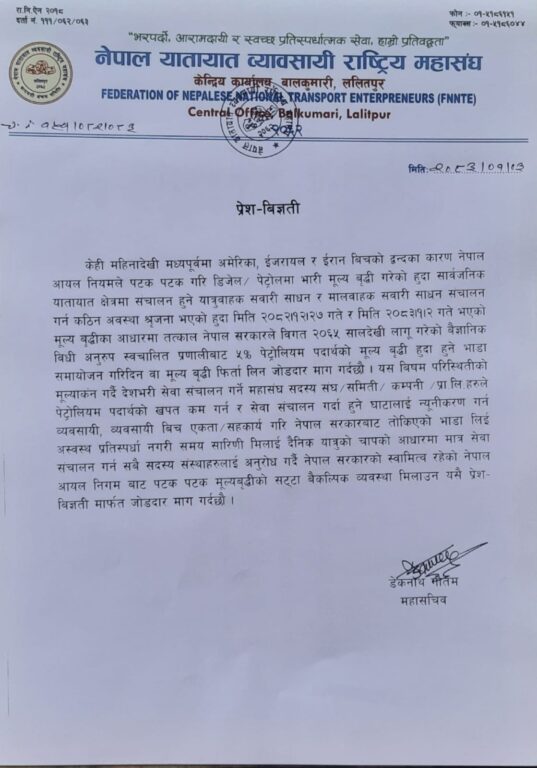 ‘नेपाल सरकारको स्वामित्व रहेको नेपाल आयल निगमबाट पटक-पटक मूल्यवृद्धिको सट्टा वैकल्पिक व्यवस्था मिलाउन यसै प्रेस विज्ञप्तिमार्फत जोडदार माग गर्दछौं,’ विज्ञप्तिमा भनिएको छ ।