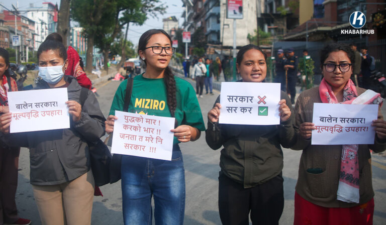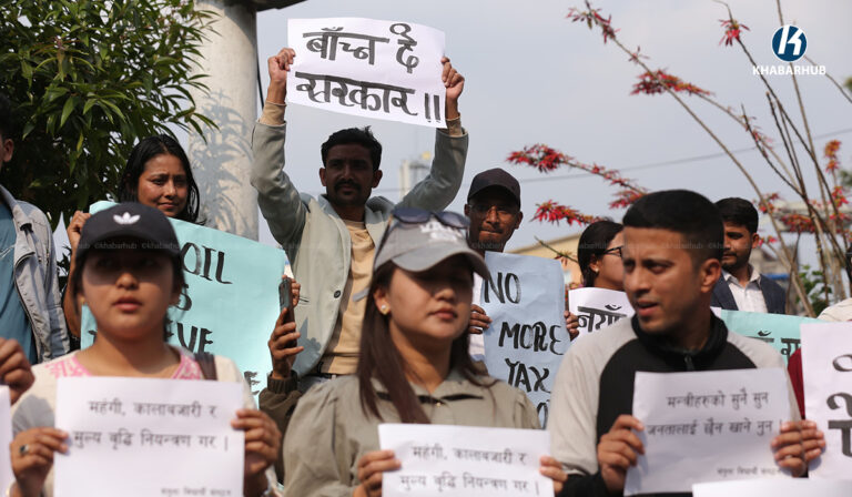 उनीहरुले बाच्न दे सरकारका, मन्त्रीको सनै सुन जनताालई छैन खाने नुन, बालेन सरकार मूल्यवृद्धि उपहार लगायतका नारा लगाएका छन् ।
