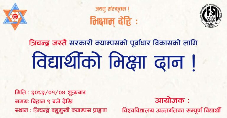 काठमाडौं– त्रिचन्द्र बहुमुखी क्याम्पसको पूर्वाधार विकासका लागि विद्यार्थीहरूले ‘भिक्षाम् देही’ अभियान सञ्चालन गर्ने भएका छन्।