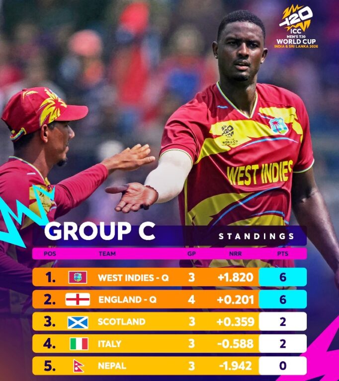 समूह सीमा वेस्ट इन्डिज ६ अंकसहित शीर्ष स्थानमा छ भने इंग्ल्यान्डसमेत ६ अंक जोडेर दोस्रो स्थानमा छ । नेपाल रहेको समूहबाट यी दुई टिम सुपर आठमा प्रवेश गर्दा इटाली, स्कटल्यान्ड र नेपाल बाहिरीसकेका छन् ।