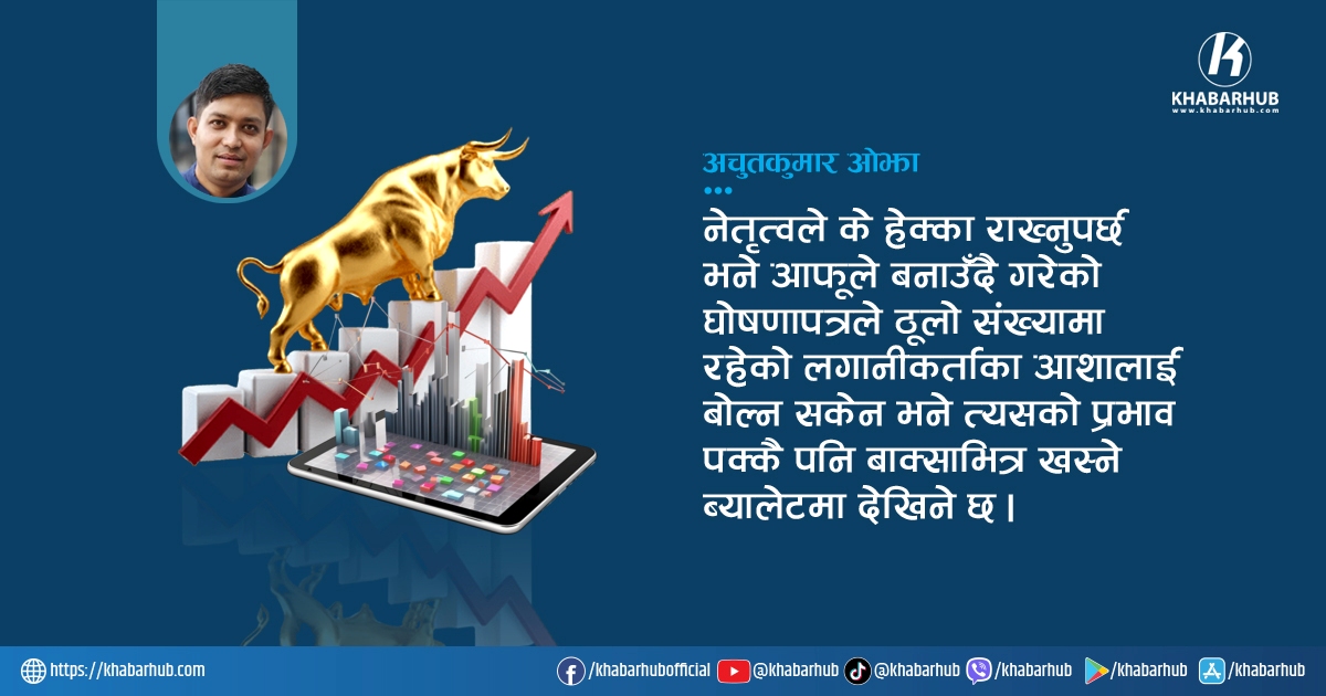 यसैले नेतृत्वले के हेक्का राख्नु पर्छ भने आफूले बनाउँदै गरेको घोषणापत्रले ठूलो संख्यामा रहेको लगानीकर्ताका आशालाई बोल्न सकेन भने त्यसको प्रभाव पक्कै पनि बाक्साभित्र खस्ने ब्यालेटमा देखिने छ ।