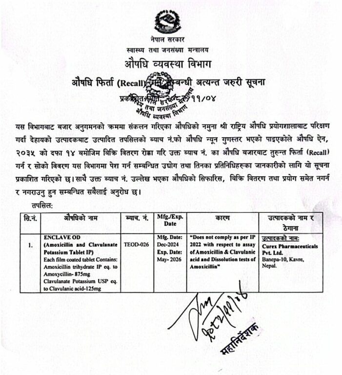 विभागका अनुसार कोरेक्श फर्माट्युकल्स प्राइभेट लिमिटेडद्वारा उत्पादित ‘एनक्लेभ ओडी एमोक्सिसिलिन र क्लाभ्युलेनेट पोटासियम ट्याब्लेट आईपी को ब्याच नम्बर टिइओडी- ०२६ मा गुणस्तरसम्बन्धी समस्या भेटिएको छ ।