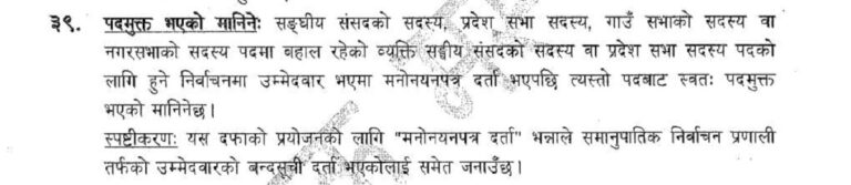 निर्वाचन आचारसंहिता २०८२ ले भने प्रतिनिधिसभा सदस्य पदका लागि हुने निर्वाचनमा उम्मेदवार भएमा मनोनयन दर्ता भएपछि बहाल रहेको पदबाट स्वतः पदमुक्त भएको मानिने व्यवस्था गरेको छ ।