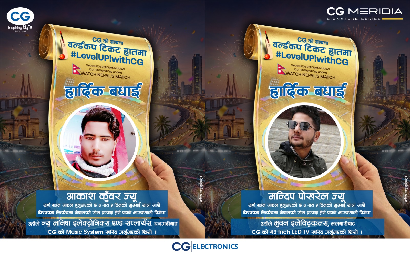काठमाडौं– इलेक्ट्रोनिक्स ब्रान्ड सिजीले ‘सिजीको साथमा, वर्ल्डकप टिकट हातमा’ ‘#लेभलअप!उइथसीजी’ योजना अन्तर्गत दोस्रो चरणका विजेता सार्वजनिक गरेको छ ।