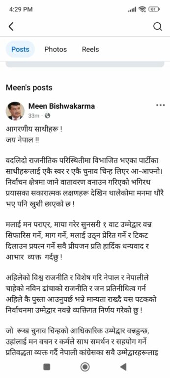 उनले पार्टीका आधिकारिक उम्मेदवारलाई मन, वचन र कर्मले साथ समर्थन र सहयोग गर्ने प्रतिबद्धता पनि जनाएका छन् ।