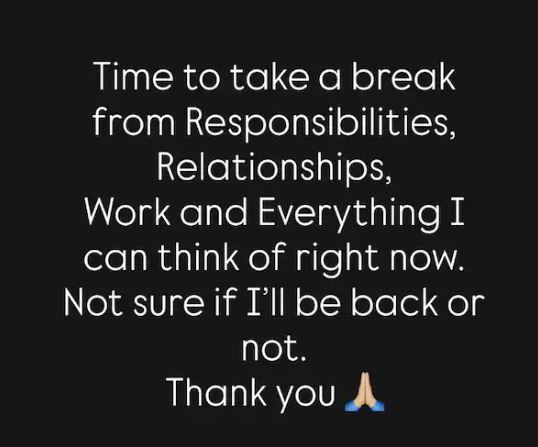 आफ्नो इन्स्टाग्राम स्टोरीमार्फत नेहाले लेखेकी थिइन्, ‘टाइम टु टेक अ ब्रेक फ्रम रेस्पोन्सिबिलिटिज, रिलेसनसिप्स, वर्क एन्ड एभ्रिथिङ आइ क्यान थिङ्क अफ राइट नाउ । नट स्योर इफ आइ विल बी ब्याक अर नट। थ्याङ्क यू ।’