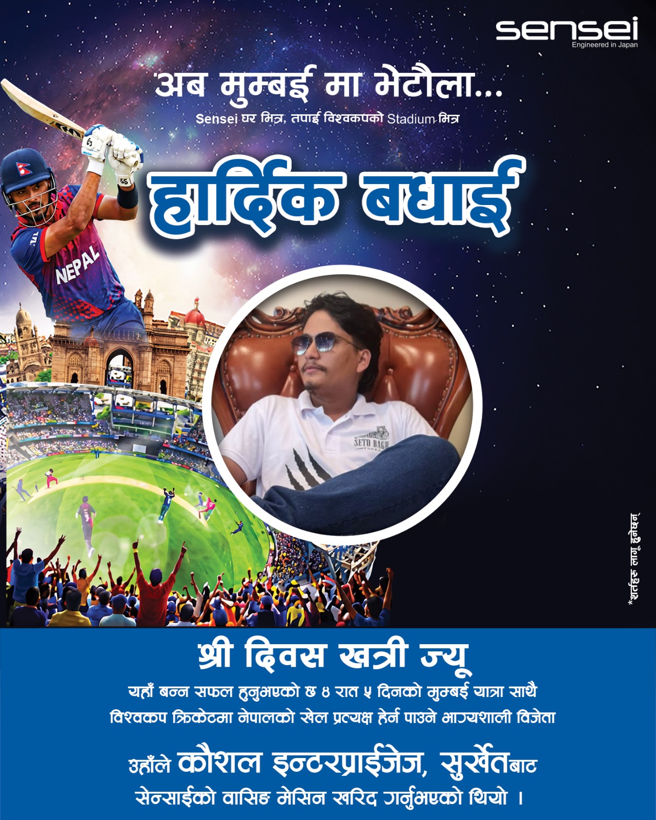 उपभोक्तालाई अत्याधुनिक प्रविधिसँगै अन्तर्राष्ट्रिय खेलकुदको रोमाञ्चसँग जोड्ने उद्देश्यले देशभर सञ्चालन गरिएको यस अभियानअन्तर्गत भाग्यशाली विजेता सुर्खेत निवासी दिवस खत्री छनोट भएका छन् । उनले कौशल इन्टरप्राइजेज सुर्खेतबाट सेन्साईको वासिङ मेसिन खरिद गरी योजनामा सहभागिता जनाएका थिए ।