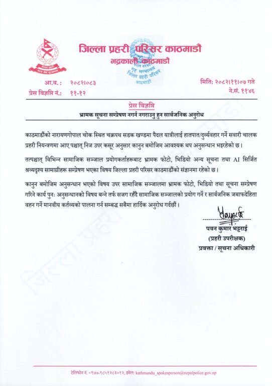 काठमाडौं परिसरका प्रवक्ता एवं प्रहरी उपरीक्षक पवन कुमार भट्टराईले बिहीबार विज्ञप्ति सार्वजनिक गर्दै यस्तो अनुरोध गरेका हुन्।