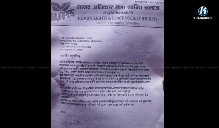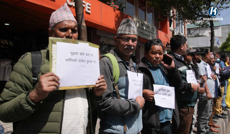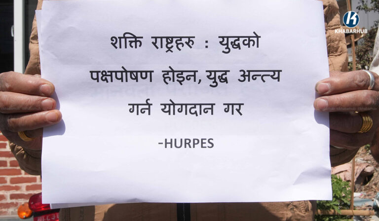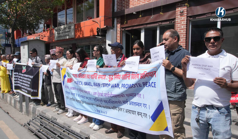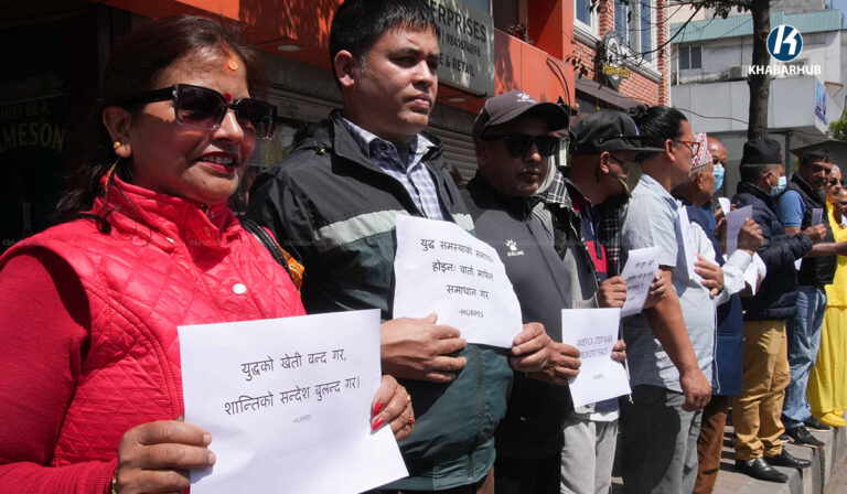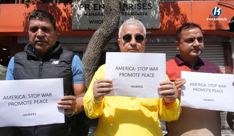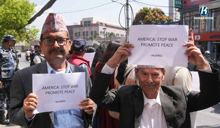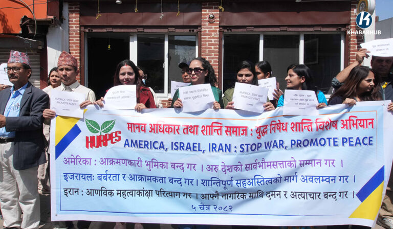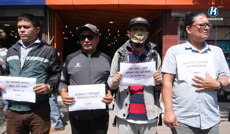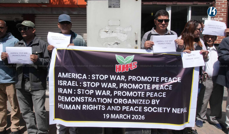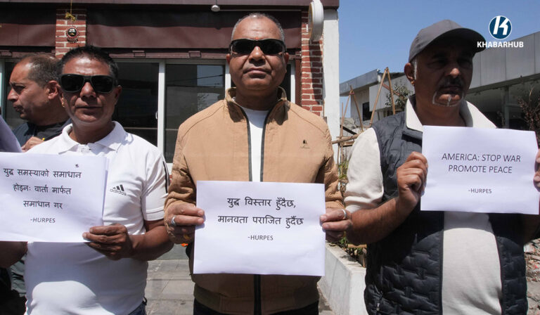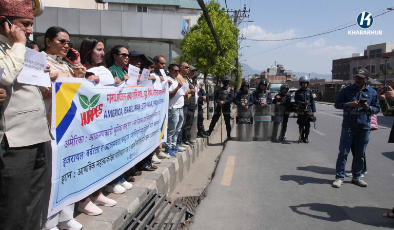युद्ध तत्काल अन्त्य हुनुपर्छ भन्ने आग्रहसहित काठमाडौंस्थित अमेरिका, इजरायलका राजदुताबास र इरानको कन्सुलेट कार्यालय अगाडी एकै दिन मानव अधिकार तथा शान्ति समाजले प्रदर्शनी गरेको छ ।