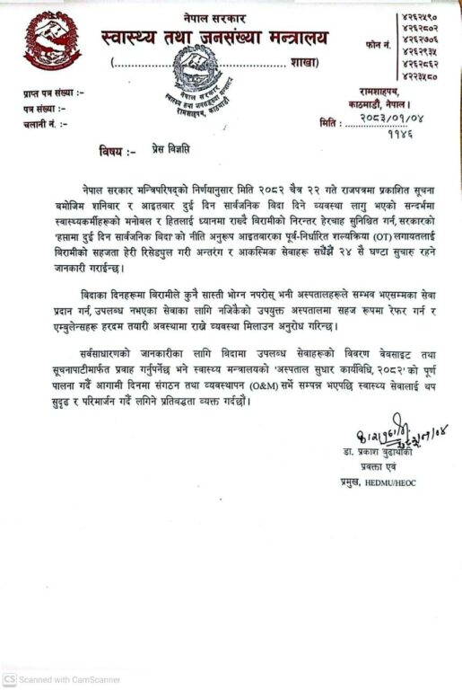 मन्त्रालयको विज्ञप्ति अनुसार मन्त्रिपरिषद्को निर्णयपछि अब शनिबार र आइतबार सरकारी अस्पतालमा पनि ओपीडी तथा शल्यक्रिया सेवा बन्द गरिएको छ । मन्त्रालयले आकस्मिक तथा अत्यावश्यक सेवाहरू २४ सै घण्टा सुचारु रहने र पूर्वनिर्धारित शल्यक्रियाहरूलाई रिसेड्युल गर्न निर्देशन दिएको छ । साथै, संगठन तथा व्यवस्थापन (ओएण्डएम) सर्वेपछि सेवा थप सहज हुने दाबी गरिएको छ ।