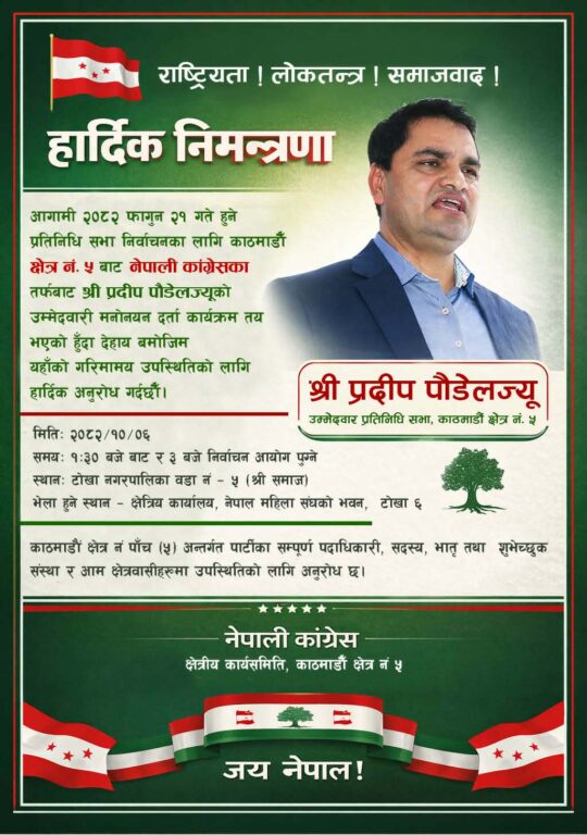 काठमाडौं – नेपाली कांग्रेसका महामन्त्री प्रदीप पौडेलले काठमाडौं क्षेत्र नम्बर ५ बाट प्रतिनिधिसभा सदस्यमा उम्मेदवारी दिने भएका छन्।