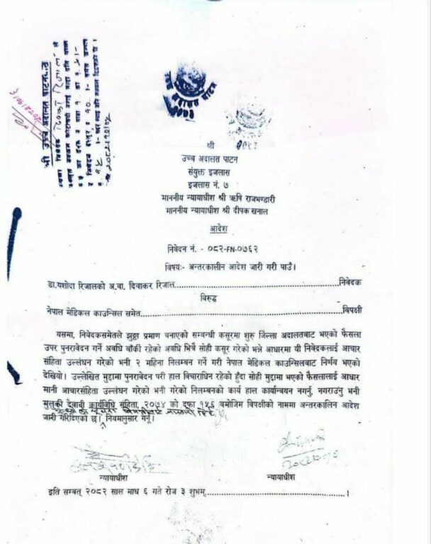 काठमाडौं – उच्च अदालत पाटनले नेपाल मेडिकल काउन्सिलले डा. यशोदा रिजालमाथि गरेको निलम्बन तत्काल कार्यान्वयन नगर्न अन्तरकालीन आदेश जारी गरेको छ ।