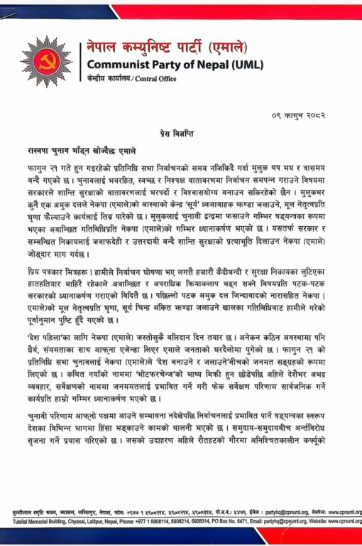 चुनावलाई भयरहित, स्वच्छ र निश्पक्ष वातावरणमा निर्वाचन समपन्न गराउने विषयमा सरकारले शान्ति सुरक्षाको वातावरणलाई भरपर्दो र विश्वासयोग्य बनाउन नसकिरहेको भन्दै एमालेले मुलुकभर कुनै एक अमुक दलले आफ्नो आस्थाको केन्द्र सूर्य अङ्कित झण्डा जलाउने, मूल नेतृत्वप्रति घृणा फैल्याउने कार्यलाई तीव्र पारेको उल्लेख गरेको छ ।