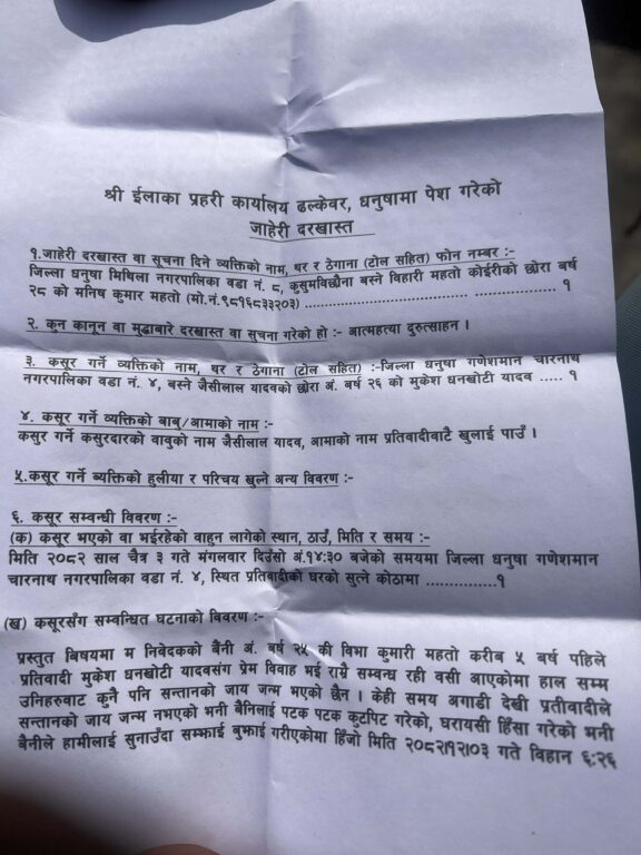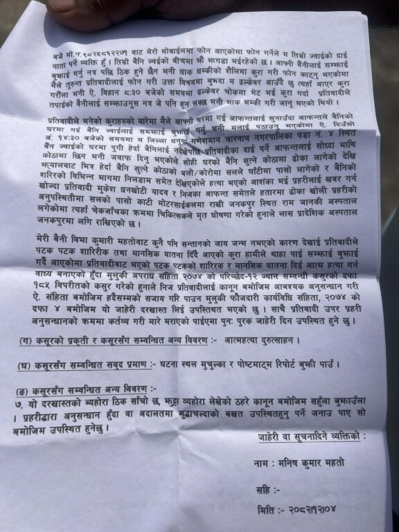 धनुषाका प्रहरी प्रवक्ता प्रहरी नायब उपरीक्षक (डीएसपी) गणेश बमले आत्महत्या दुरुत्साहनमा जाहेरीका आधारमा पति मुकेश धनखोटी यादवलाई पक्राउ गरेर अनुसन्धान अघि बढाएको जानकारी दिए । उनले भने, ‘पीडित माइतीपक्षले आत्महत्या दुरुत्साहनको जाहेरी दिएको छ । हामी अनुसन्धानकै क्रममा छौँ ।’