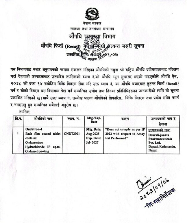विभागका अनुसार ओन्डाट्रोन–४ (ओन्डान्सेट्रोन हाइड्रोक्लोराइड ४ मिलिग्राम) को ब्याच नम्बर ओएनडीटी २९०१ रहेको छ । उक्त औषधिको उत्पादन मिति अगस्ट २०२५ र म्याद सकिने मिति जुलाई २०२७ रहेको छ ।