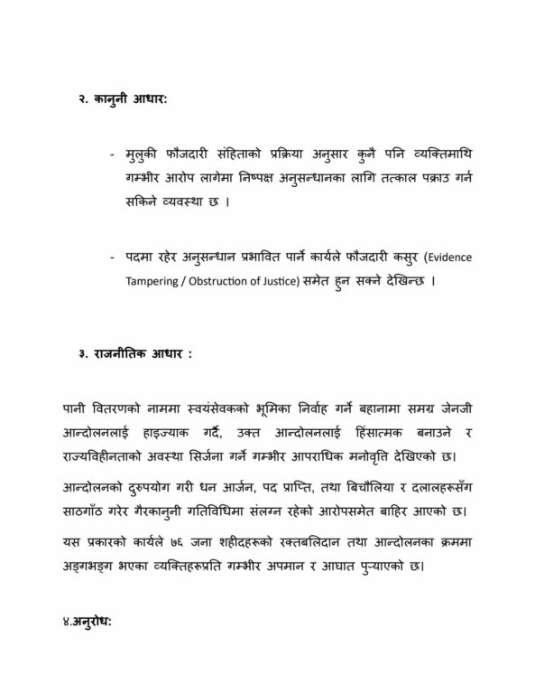 निवेदनमा मुलुकी फौजदारी संहिताको आधार उल्लेख गर्दै गम्भीर आरोप लागेका व्यक्तिलाई आवश्यक परे पक्राउ गरी अनुसन्धान अघि बढाउन सकिने कानुनी व्यवस्था रहेको उल्लेख गरिएको छ।
