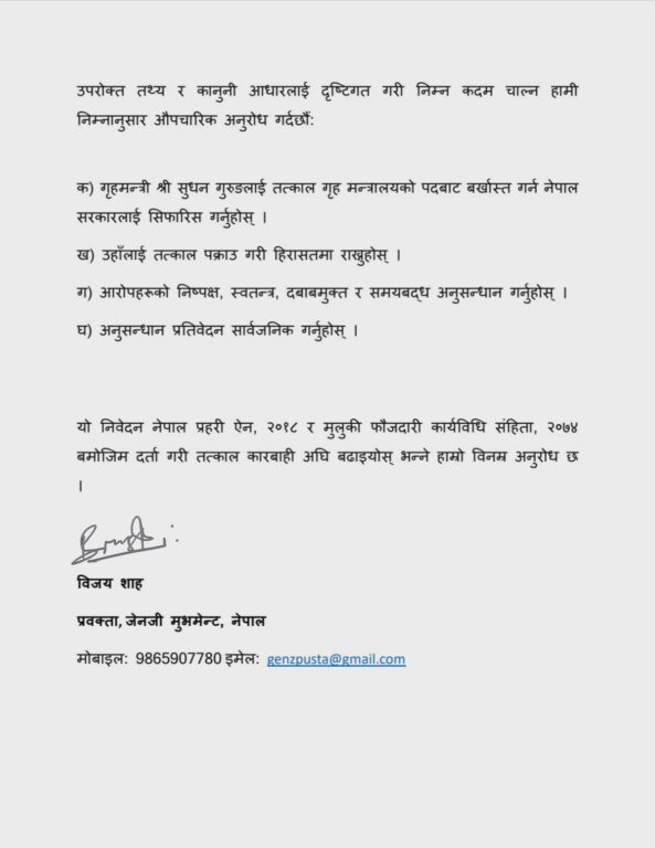 निवेदनमार्फत जेन-जी मुभमेन्टले गृहमन्त्रीलाई पदबाट हटाउन सरकारलाई सिफारिस गर्न, तत्काल पक्राउ गर्न, निष्पक्ष अनुसन्धान अघि बढाउन र अनुसन्धान प्रतिवेदन सार्वजनिक गर्न माग गरेको छ।