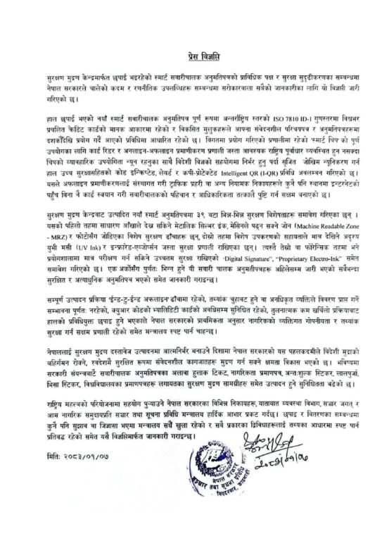 सरकारले जेन–जी आन्दोलनयता मात्रै केन्द्रबाट लाइसेन्स छपाइ थालेको हो । ‘हाल छपाइ भइरहेको लाइसेन्स अन्तर्राष्ट्रिय स्तरको आईएसओ ७८१० आईडी ९१ गुणस्तरको रहेको छ । जुन विकसित मुलुकले दशकौँदेखि प्रयोग गर्दै आएको प्रविधिमा आधारित विश्वभर प्रचलित क्रेडिट कार्डको मानक आधारमा तयार पारिएको छ,’ विज्ञप्तिमा उल्लेख छ ।