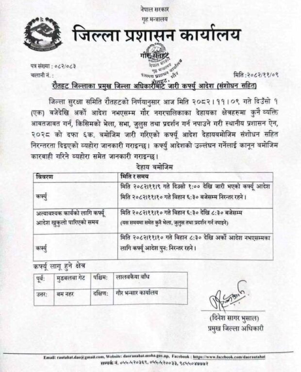 काठमाडौं – जिल्ला प्रशासन कार्यालय, रौतहटले आइतबार बिहान साढे ८ बजेदेखि कर्फ्युमा कडाइ गरेको छ । बिहान केही समय खुकुलो पारिएको कर्फ्युमा अहिले कडाइ गरिएको हो । बिहीबारदेखि तनाव बढ्दा रौतहटमा सुरक्षा चुनौती थपिएको भन्दै जिल्ला प्रशासनले कर्फ्यु लगाएको हो ।