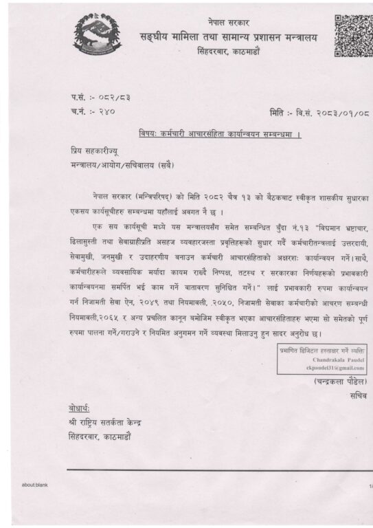 काठमाडौं- सङ्घीय मामिला तथा सामान्य प्रशासन मन्त्रालयले कर्मचारी आचारसंहिताको प्रभावकारी कार्यान्वयन गर्न सबै मन्त्रालय, आयोग र सचिवालयलाई निर्देशन दिएको छ।