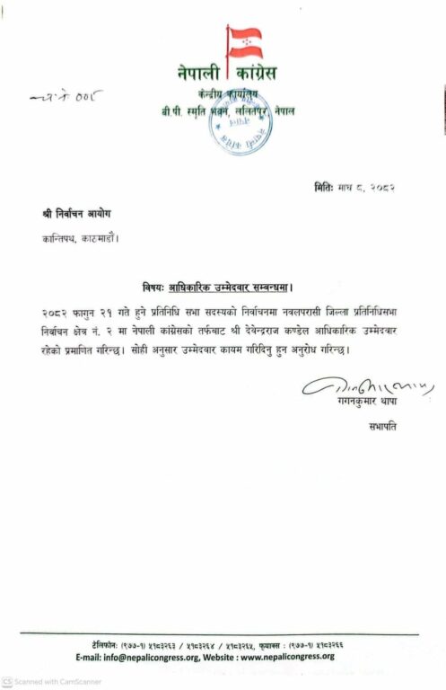 सभापति थापाले निर्वाचन आयोगलाई पठाएको पत्रमा कँडेललाई सोही अनुसार उम्मेदवार कायम गर्न अनुरोध गरिएको छ।