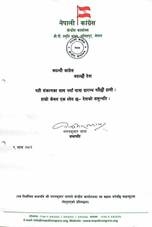 ‘बदल्यौं कांग्रेस, बदल्छौं देश । यही संकल्पका साथ नयाँ यात्रा प्रारम्भ गर्दैछौं हामी । हाम्रो केवल एक ध्येय छ– देशको समुन्नति,’ उनले भने माइन्यूटमा लेखेका छन् ।