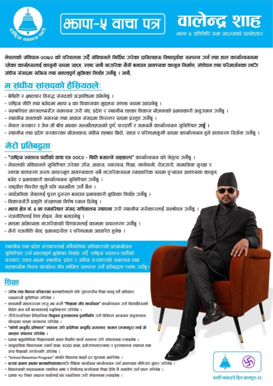 काठमाडौं – राष्ट्रिय स्वतन्त्र पार्टी (रास्वपा) का नेता बालेन शाहले आफ्नो चुनावी घोषणापत्र सार्वजनिक गरेका छन् । झापा क्षेत्र नं. ५ बाट उम्मेदवार रहेका शाहले आफ्नो घोषणापत्रलाई ‘झापा–५ वाचापत्र’ नाम दिएका छन् । उनले सङ्घीय सांसदको हैसियतले गर्ने काम उक्त वाचापत्रमा समेटेका छन् ।