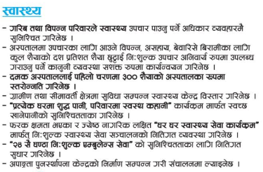 यस्तै, २४ सै घण्टा निःशुल्क एम्बुलेन्स सेवा सुनिश्चित गर्न नीतिगत सुधार गरिने र अपाङ्गता पुनर्स्थापना केन्द्रको निर्माण सम्पन्न गरी सञ्चालनमा ल्याइने प्रतिबद्धता पनि बाचा पत्रमा उल्लेख छ ।