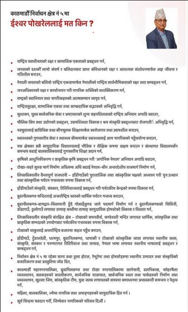 काठमाडौँ– काठमाडौं निर्वाचन क्षेत्र नंम्बर ५ मा उम्मेदवार रहेका एमाले नेता ईश्वर पोखरेललाई नै मत किन भन्दै एमालेले आफ्नो धारणा सार्वजनिक गरेको छ । राष्ट्रिय स्वाधीनताको रक्षा, सामाजिक एकताको प्रवर्द्धन, संविधानको संरक्षण तथा सुशासनमार्फत समृद्धिको यात्रालाई अगाडि बढाउने लक्ष्यसहित उनलाई समर्थन गर्न अपिल गरिएको हो ।